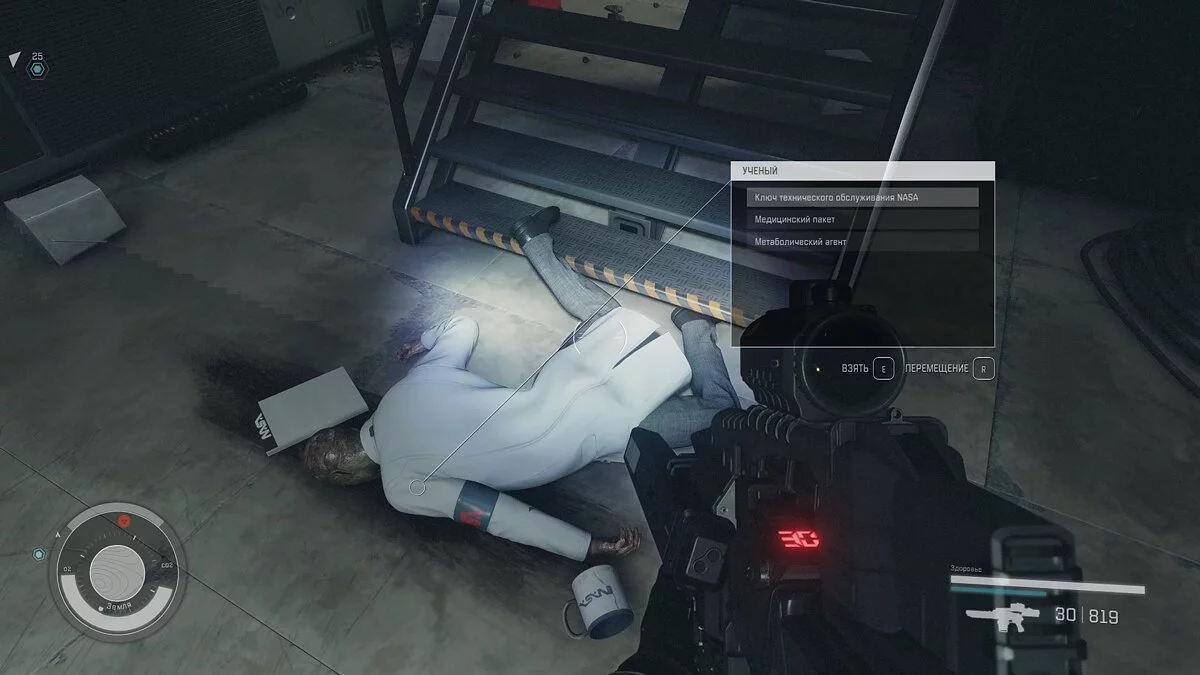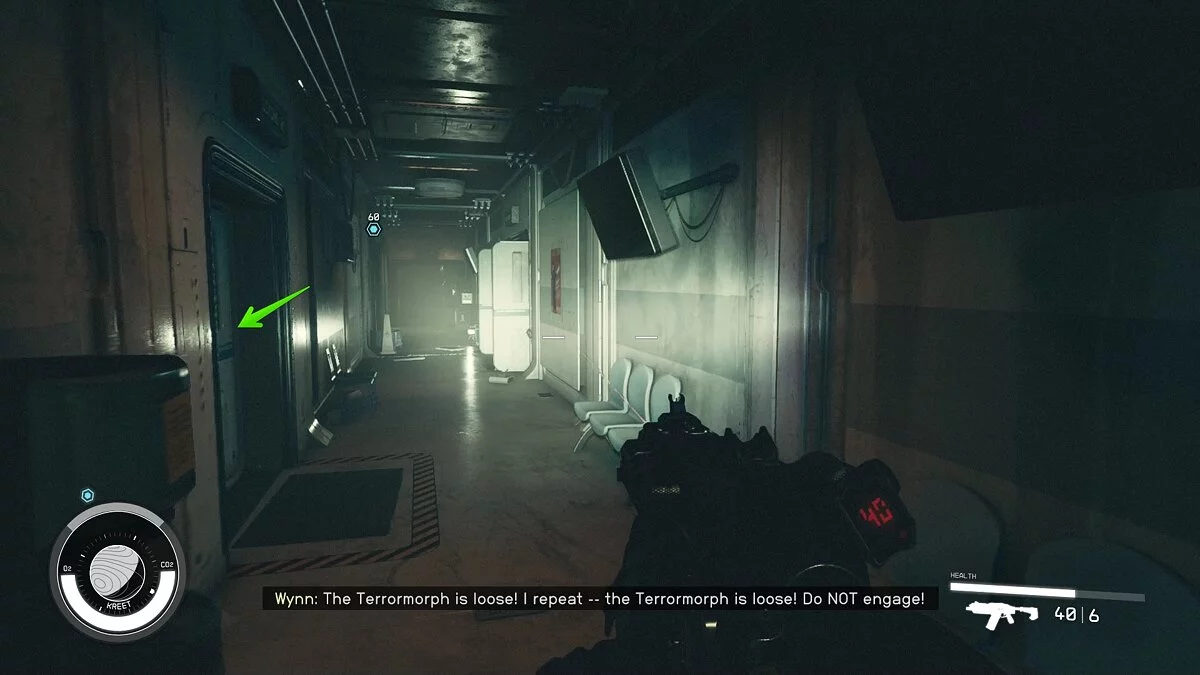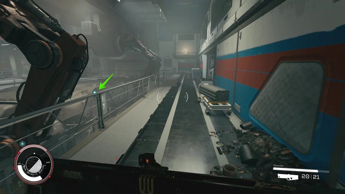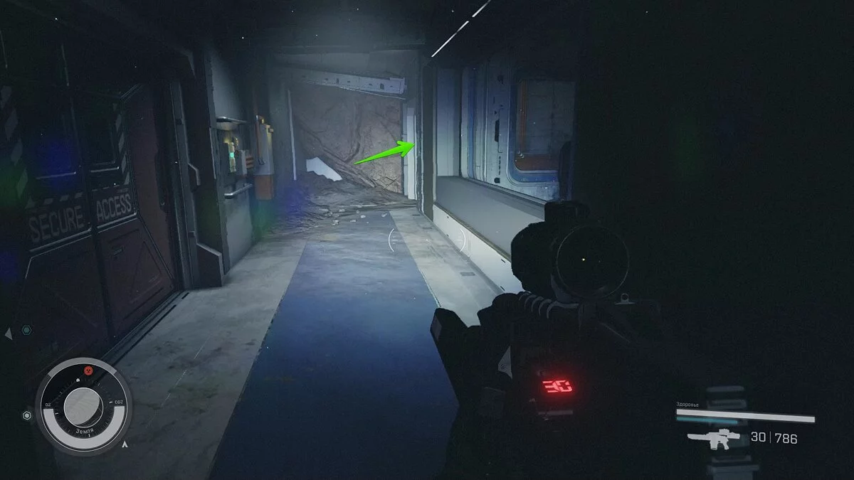 Продолжайте бежать от маркера к маркеру, пока не окажетесь у очередного терминала. Здесь будет развилка — можете спуститься на один уровень вниз по шахте лифта и подобрать ключ-карту на столе в коридоре или пройти по лестничной клетке и получить такую же карту, но с трупа.