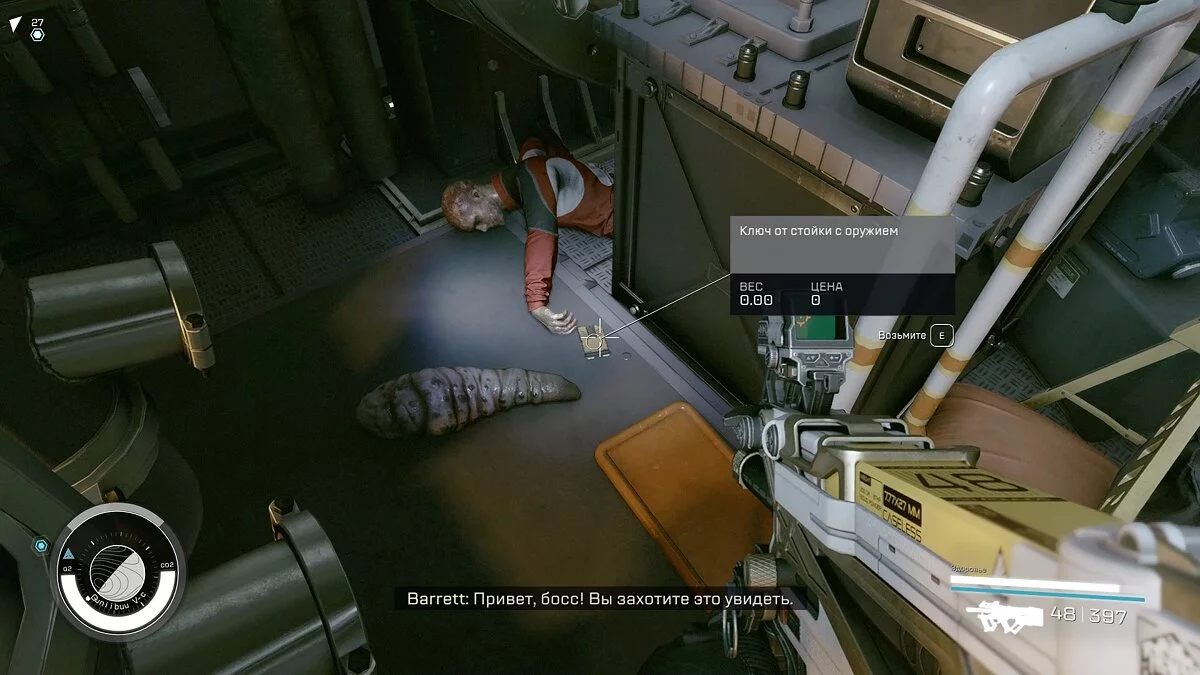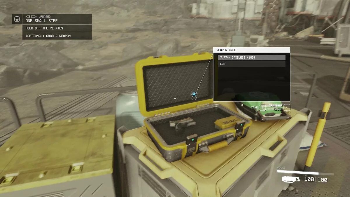 Дождитесь, пока на посадочную площадку приземлится корабль, затем выслушайте Баррета. Сразу после диалога на станцию нападут пираты — возьмите своё первое оружие из жёлтого ящика, отбейтесь от врагов и снова пообщайтесь с приятелем.