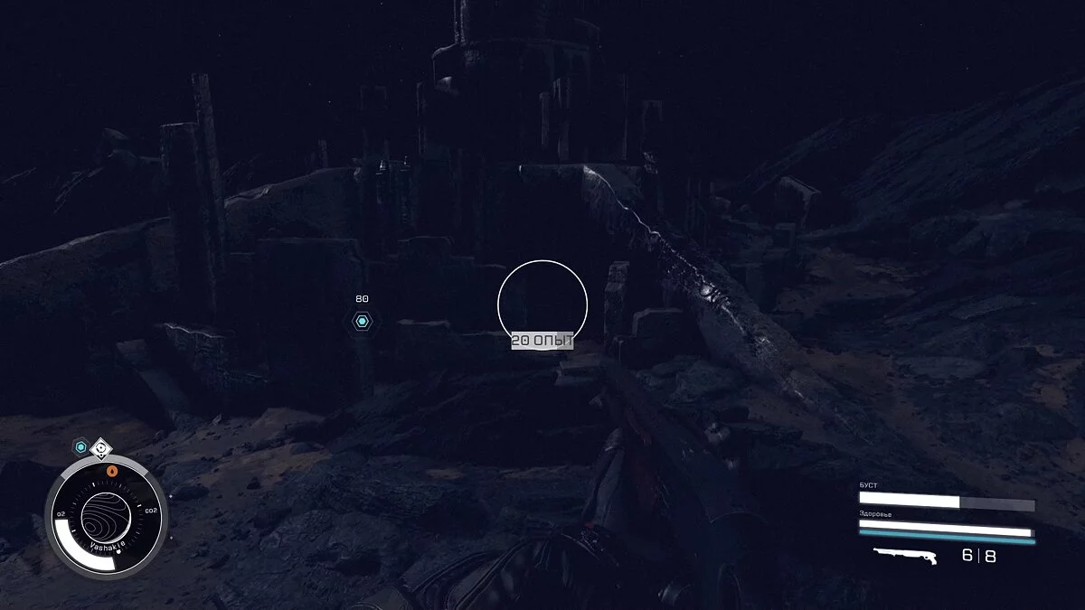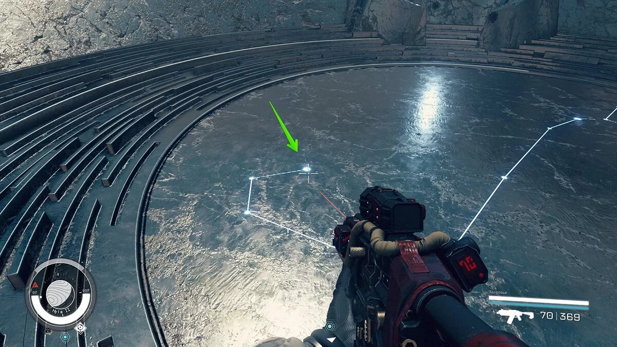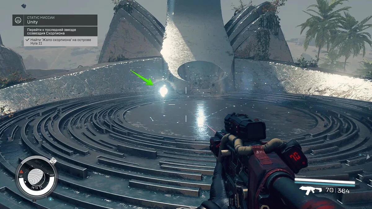На карте будет отображаться локация, где находится храм, однако конкретная точка не указана. После приземления откройте сканер на кнопку «F» и вращайте камеру. Вы увидите изменения интерфейса (глитчи). Зафиксируйте направление и следуйте в эту сторону. Оказавшись неподалёку от храма, появится маркер синего цвета.
