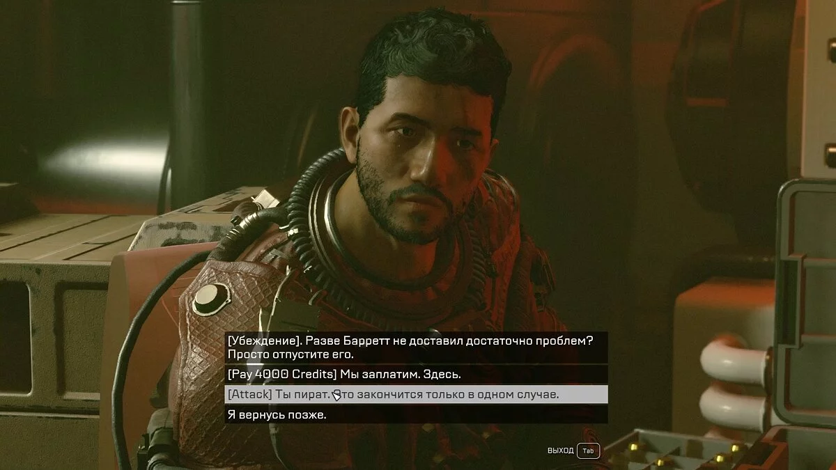 Выбравшись на поверхность, вы встретитесь с главарем пиратов. Можете солгать ему, чтобы избежать сражения. Однако мы не стали делать этого и перебили отряд. Когда сражение закончится, используйте сканер, чтобы быстро переместиться на свой корабль. Подробнее о механиках быстрого перемещения в игре мы рассказали здесь.
