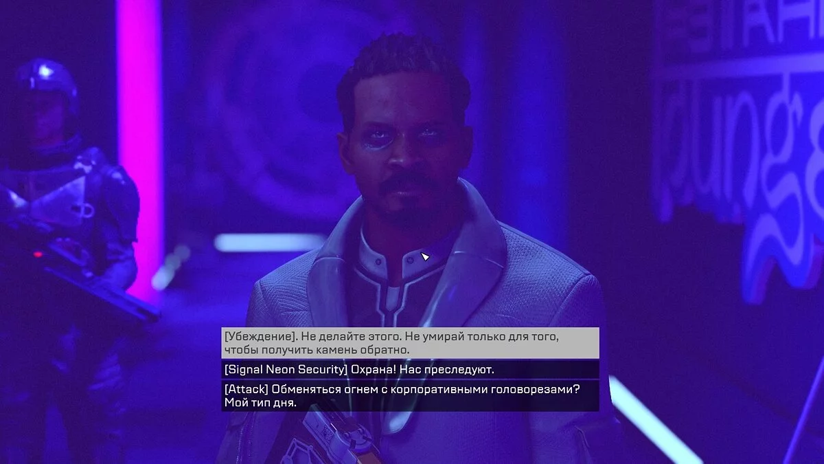 На выходе вас встретит Шоу вместе со своей бандой. Можете использовать убеждение, заплатить 4000 кредитов или убить их. Если выберите первый вариант, используйте следующие ответы: