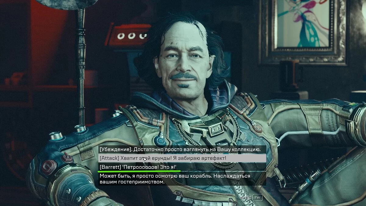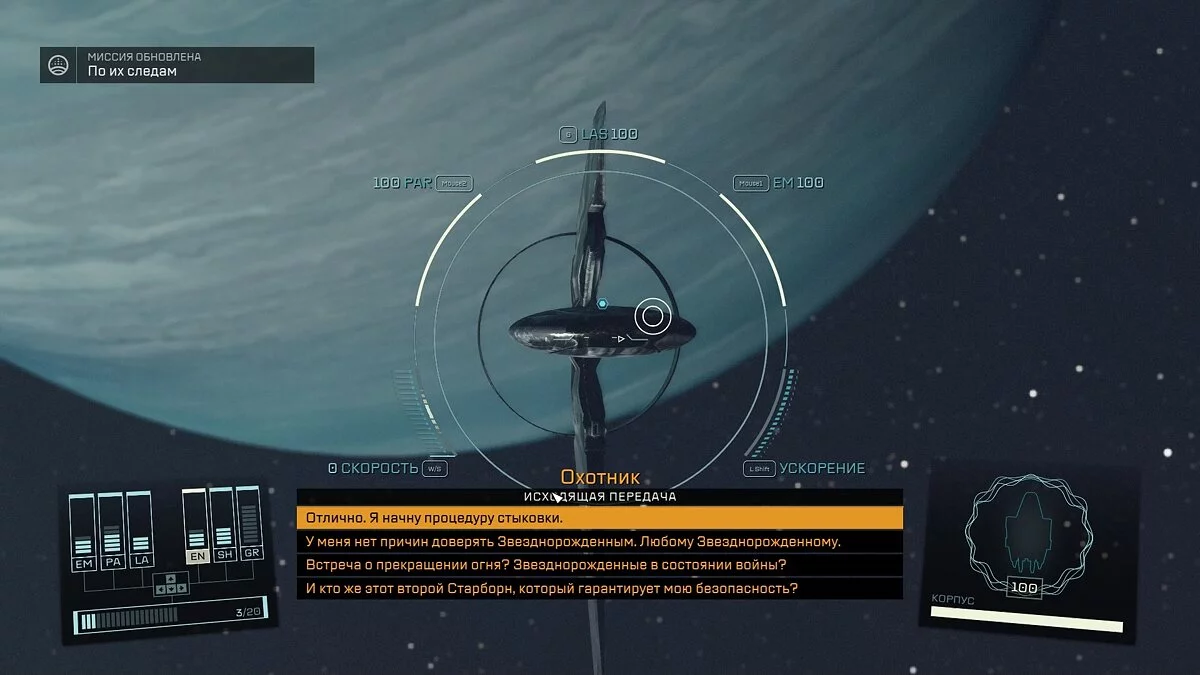 Выслушайте Охотника и Эмиссара, после чего сможете расспросить их подробнее (опционально). Сделав это, выйдите в открытый космос и вернитесь на базу «Созвездия».