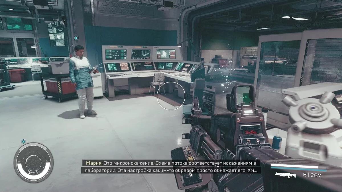 В первой комнате справа переместитесь в мир после аварии и пройдите через дверь. Неподалёку от пульта есть ещё одна аномалия. Вернитесь обратно и взаимодействуйте с консолью, чтобы открыть дверь. Можете попытаться отключить турели и сигнализацию, но нам это не помогло: роботы и турели всё равно появлялись после завершения подзадач.
