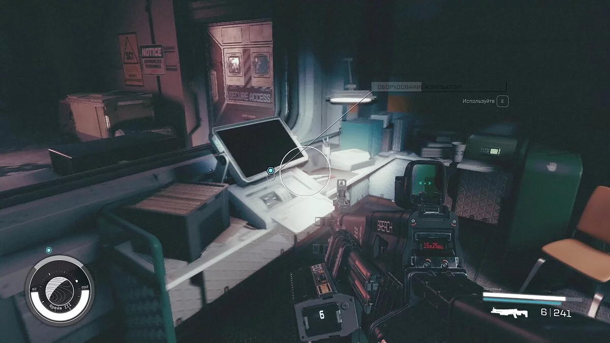 Направляйтесь в лабораторию. По пути осматривайте трупы и подбирайте ценные предметы. Следуя за маркером вы наткнётесь на группу пиратов — перебейте их. В длинном коридоре откройте первую дверь слева и зайдите в дальнюю комнату. Здесь есть сейф, рядом с которым лежит цифровая отмычка (digitpick). Это один из первых замков в игре, который вы можете вскрыть прямо сейчас. Если вы ещё не изучили механику взлома, обязательно прочтите этот гайд.