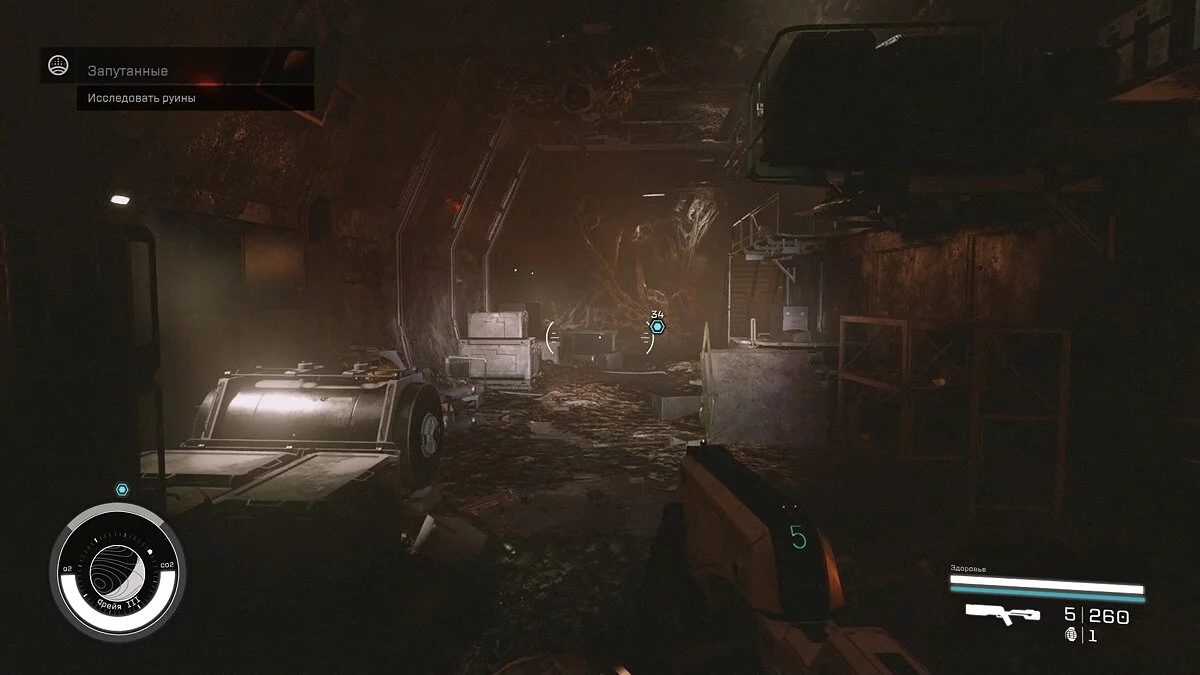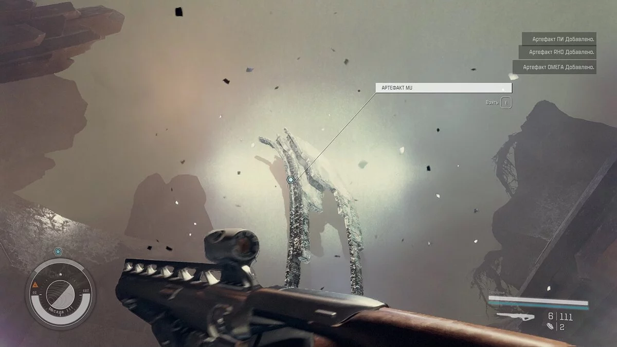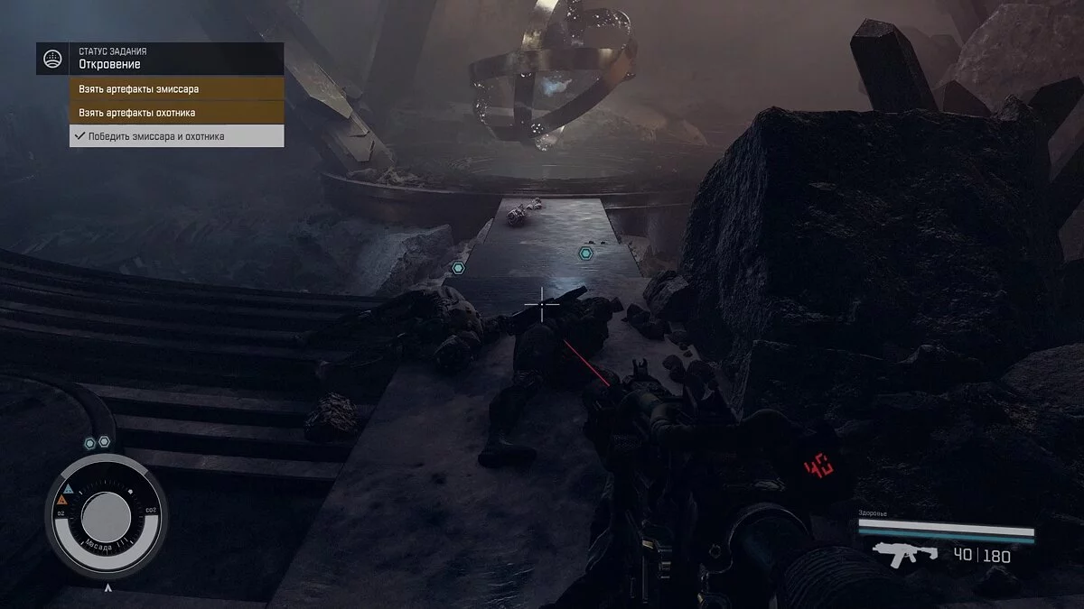 Внутри разберитесь со всеми врагами и пробейтесь к артефакту. Как обычно, перед квестовым предметом появится охотник. Ликвидируйте его и возвращайтесь на корабль.