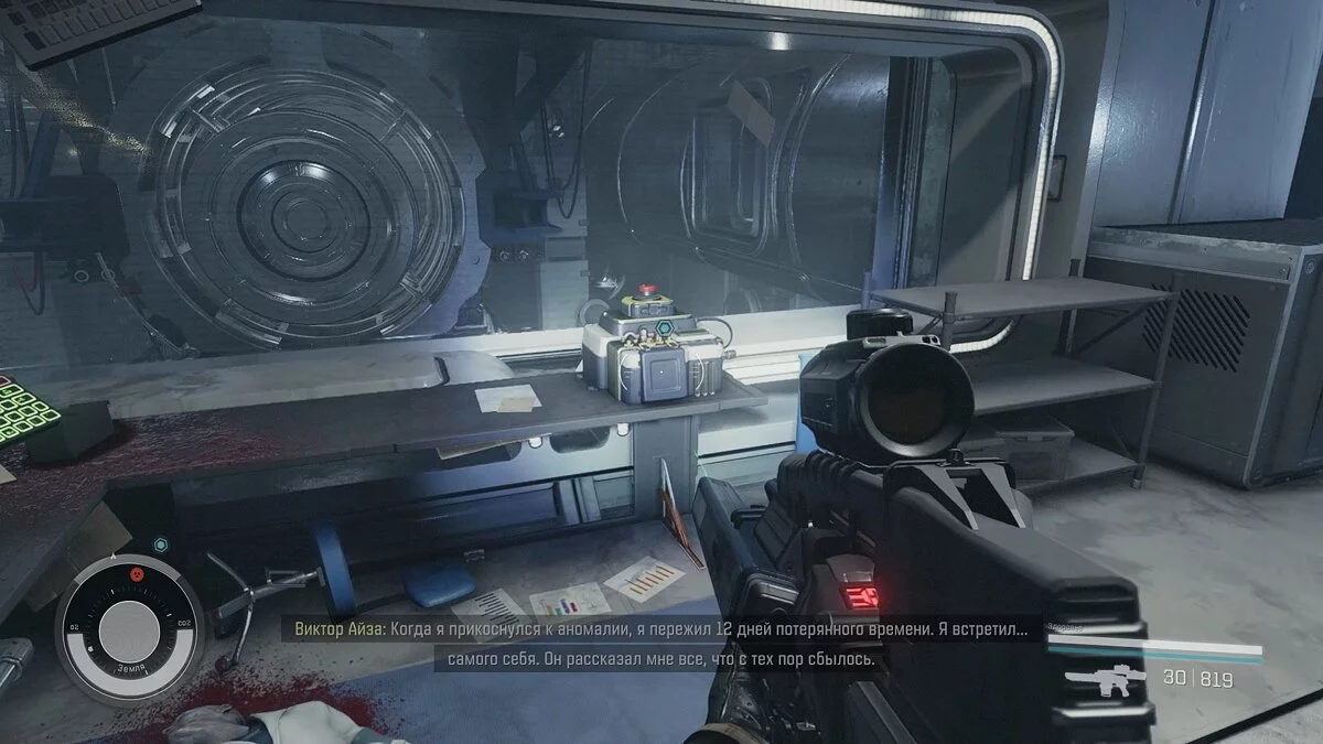 Используйте искажение и пройдите в дальнюю правую комнату. Здесь будет ещё одна аномалия — вернитесь в мир до аварии. Так вы сможете подобрать на столе ключ-карту от дверей на верхнем уровне. Однако здесь же появятся роботы и несколько турелей.