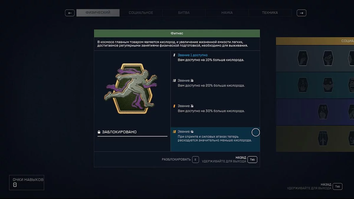 Увеличить базовый уровень кислорода можно, открыв навык «Фитнес» (Fitness), который заметно поднимет общую выносливость персонажа. Это самый быстрый способ навсегда увеличить запас кислорода. Также изучите навык «Гимнастика» (Gymnastics), чтобы на третьем уровне открыть возможность восстанавливать O2 при подтягивании (подъемах). В игре много еды и напитков, которые восстанавливают здоровье и запасы выносливости, поэтому навык «Питание» (Nutrition) поможет увеличить их эффективность.