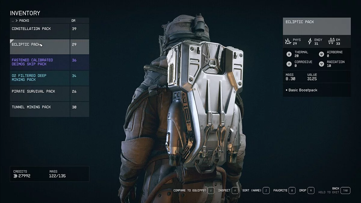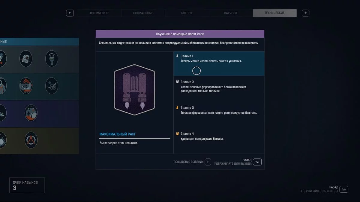 В Starfield огромное количество рюкзаков, но не каждый является бустпаком. Проверить это можно, открыв особые свойства предмета. Вы в любой момент можете изменить тип бустпака, воспользовавшись верстаком для улучшения космического скафандра. Для стабильно быстрого перемещения по локации даже с перегрузом вам понадобится максимально улучшенный навык «Бустпак» (Boost Pack) и Balanced Boost Pack.