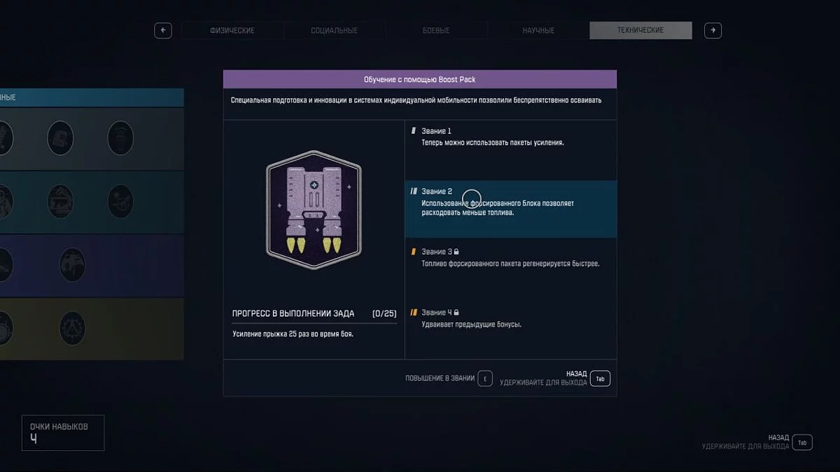 Даже если вы решите проблему с кислородом, это не спасёт вас от перегруза. В игре огромное количество предметов, которые хочется забрать себе, и лимит в переносимом весе может испортить вам игровой опыт. Для обхода потери скорости можете использовать бустпак, у которого свой отдельный заряд. Чтобы его активировать, откройте навык «Бустпак» (Boost Pack). Так вы получите стартовый ранец, но в процессе игры сможете подобрать другой вариант. Для улучшения навыка достаточно определённое количество раз активировать бустпак в бою (15/25/50/100) , дважды нажав кнопку прыжка.