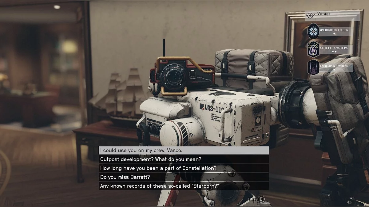 Тяжелый робот-погрузчик Васко присоединится к вам в самом начале игры. У него встроенное лазерное оружие. Дроид дает ряд полезных улучшений для звездолета: