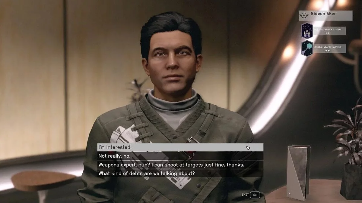 И еще один друг из бара, всё того же. Гидеон поможет модернизировать вооружение корабля. Изначально он хочет 16 500 кредитов, но при должном уровне «Убеждения» снизит цену до 8250.