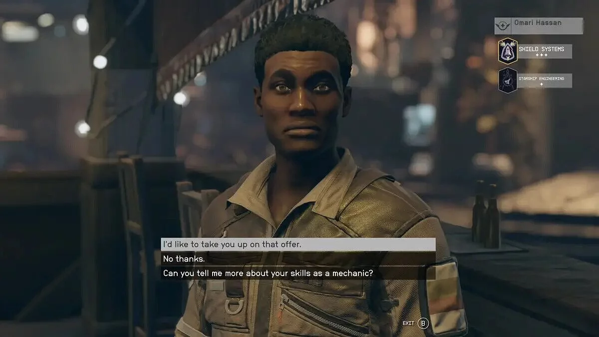 Омари ждет вас в том же баре, что и Рози (Hitching Post). Мужчина инженер и поможет усилить ваши щиты на корабле. Нанять его можно за 15 000 кредитов или за 7500, если уговорить.