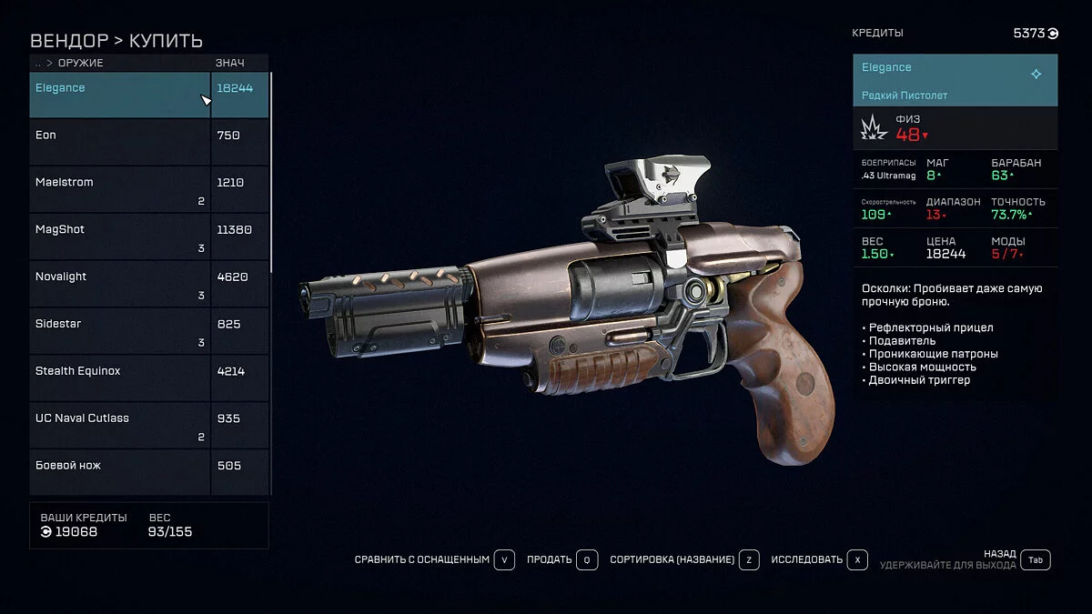 В центре перечислены возможные модификации. Нажмите на категорию, чтобы открыть конкретные варианты. Под миниатюрой оружия вы найдете описание улучшения и свойства, на которые мод окажет влияние.
