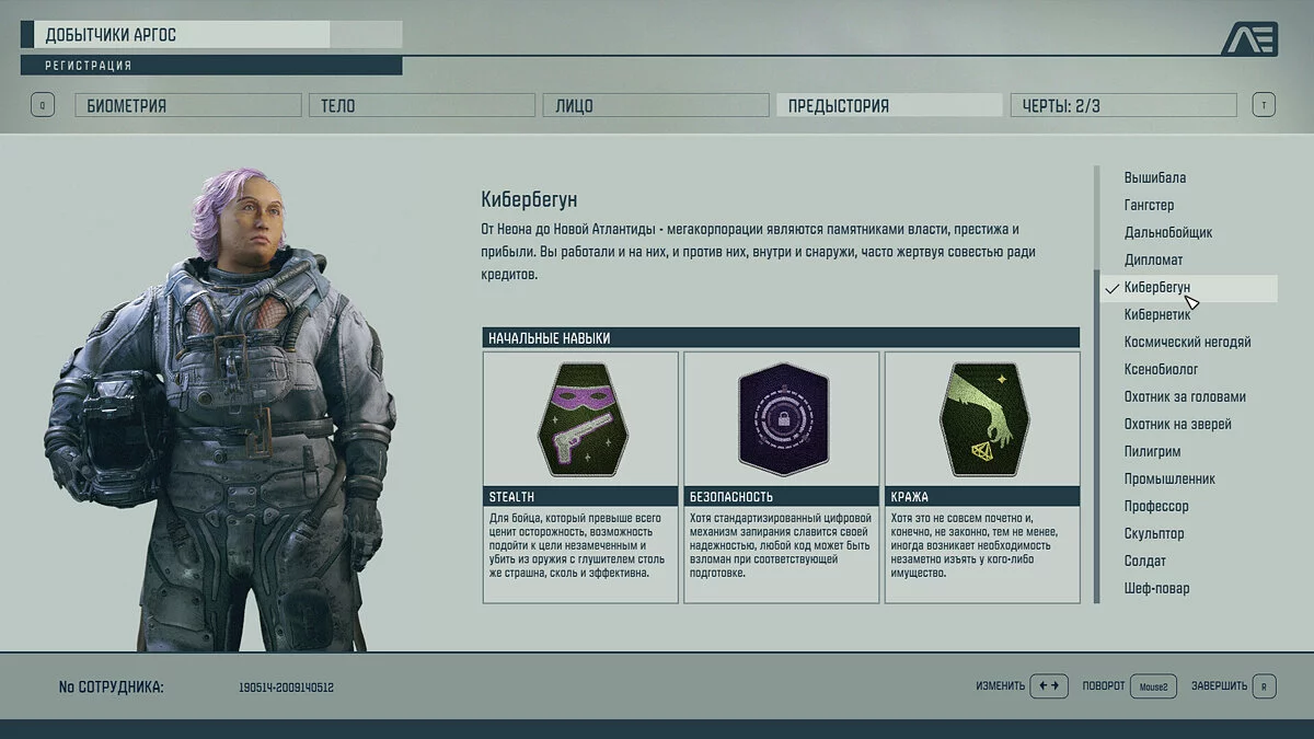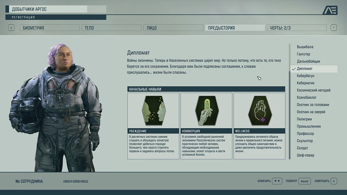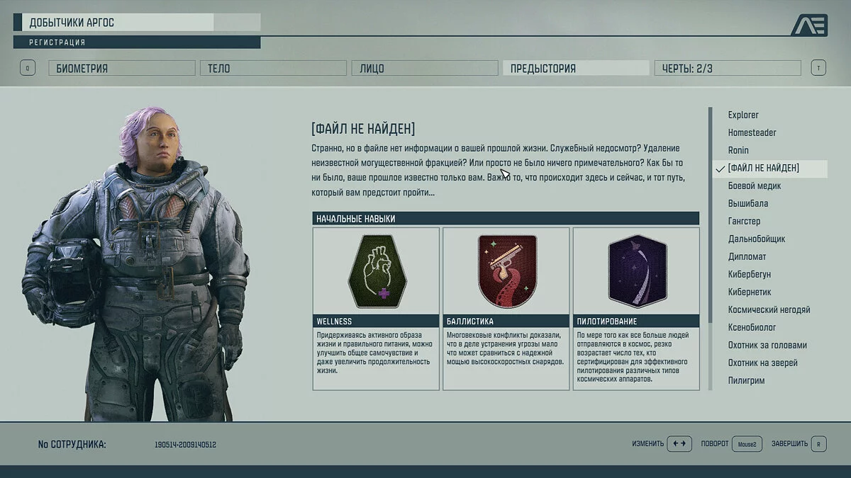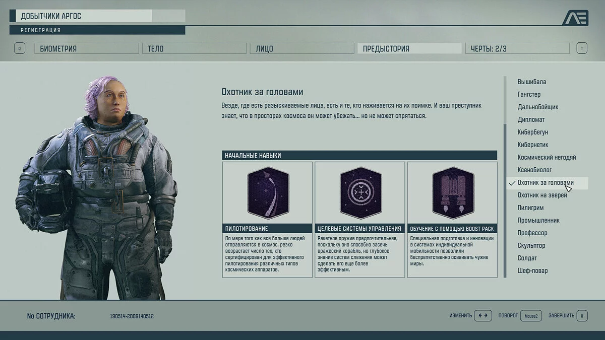 - Космический негодяй (Space Scoundrel). Навыки: «Убеждение» (Persuasion) — умение договариваться с NPC; «Сертификат по пистолетам» (Pistol Certification) — увеличение урона от пистолетов; «Пилотирование» (Piloting) — разблокировка доступа к кораблям более высокого уровня.