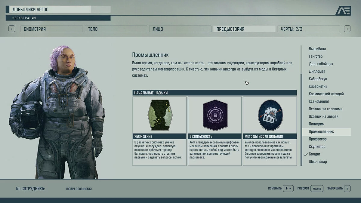 - Промышленник (Industrialist). Навыки: «Безопасность» (Security) — умение взламывать сложные замки; «Убеждение» (Persuasion) — умение договариваться с NPC; «Исследовательские методы» (Research methods) — снижение стоимости различных исследований на станциях.