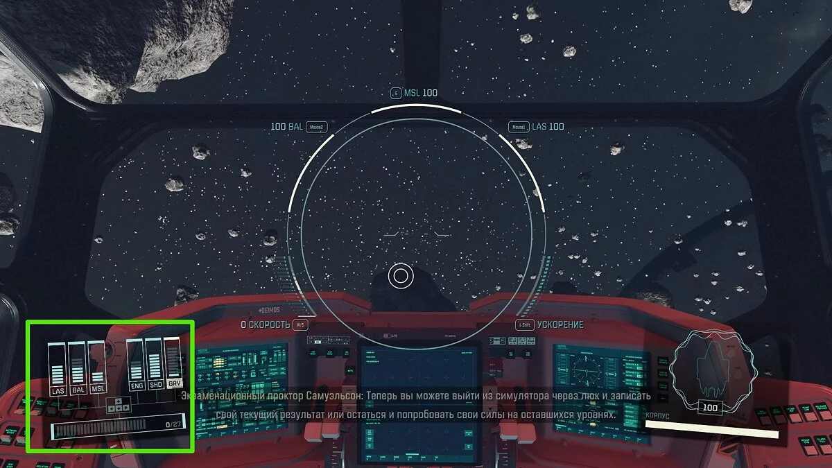 Всего будет доступно шесть уровней сложности, но для прохождения квеста достаточно завершить четыре. Сразу отрегулируйте параметры судна: отнимите несколько единиц с показателя GRV (гравипривод) и распределите их по SHD (щит), BAL (дополнительное оружие) и ENG (двигатель).