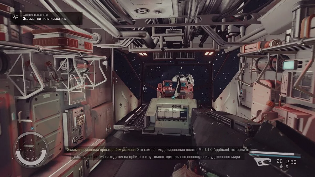 Выполнив условия, начнётся первое задание. В этом же помещении садитесь в лифт и отправляйтесь в Ориентационный зал. Воспользуйтесь консолью, чтобы зарегистрироваться. После пройдите по большому выставочному залу и доберитесь до отдела, где нужно войти в импровизированную кабину пилота.