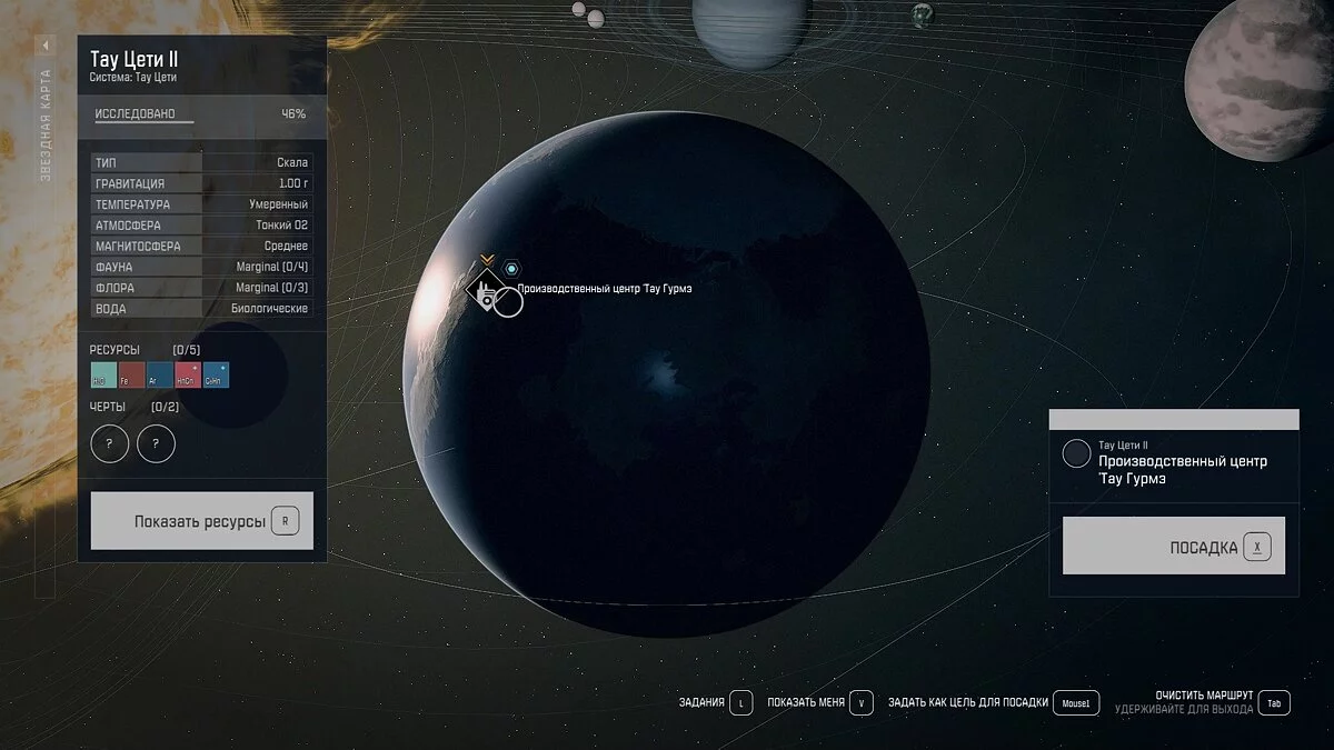 Сперва отправляйтесь в космопорт и получите информацию от техника. Задание обновится — вам нужно добраться до планеты Тау Цети II, что в одноименной системе. Для приземления будет доступна единственная локация «Производственный центр».