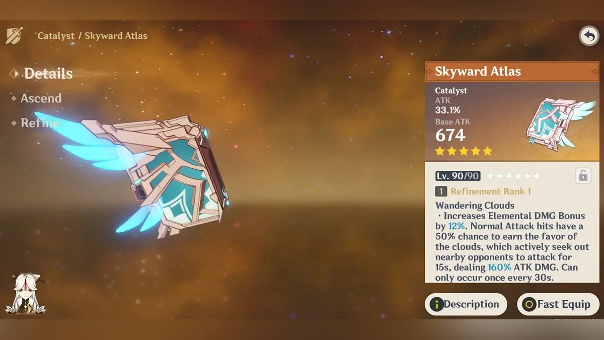 Небесный атлас. Ещё один отличный пятизвёздочный катализатор. Базовый урон — 48-674, причём сила атаки дополнительно увеличена на 12-24%. Если обычный удар настигнет противника, то есть 50%-ная вероятность получить эффект Благословения облаков. В этом случае ближайшие враги будут получать урон в размере 160-320% от вашей силы атаки в течение 15 секунд. Бонус может возникнуть 1 раз в 30 секунд.