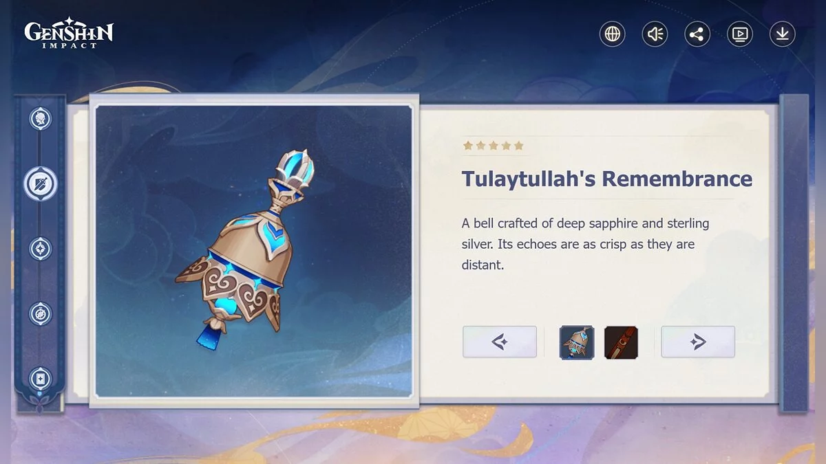 Воспоминания Тулайтуллы. Пятизвёздочный катализатор, который повышает эффективность обычных атак героя, поэтому отлично подойдёт Ризли. Его базовый урон — 48-671 единица, а критический урон составляет 9,6-44,1%, а скорость ударов повышается на 10-20%. Во время действия элементального навыка обычные атаки становятся сильнее на 4,8-9,6% за каждые 0,3 секунды. Максимальное увеличение урона может достичь 48-96%. Эффект сбросится при окончании действия элементального навыка, повторном использовании или если герой покинет сражение.