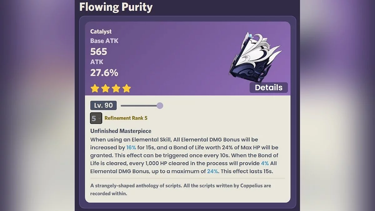 Сверкание чистых вод. Бесплатное четырёхзвёздочное оружие, которое можно считать крайним вариантом. Однако если у вас нет возможности провести «крутки», то всегда можно собрать катализатор самому. Его базовая атака — 44-565 единицы, а бонус к урону достигает 6%-27,6%. Использование элементального навыка увеличивает элементальный урон на 8-16% в течение 15 секунд, а также накладывает эффект Долга жизни на 10 секунд. Благодаря ему шкала здоровья персонажа повышается на 24%. Когда этот статус отменяется, в течение ещё 15 секунд ваша атака вырастет на 2-4% за каждые потраченные 1000 единиц жизненной силы, но не более 12-24%.