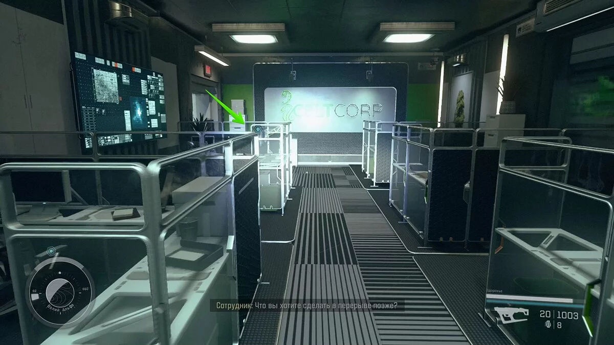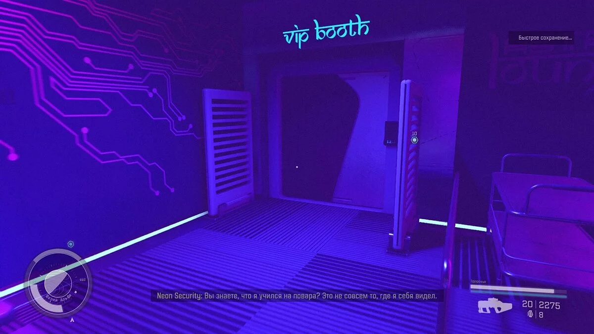 Спуститесь на этаж ниже и войдите в кабинет охраны. Здесь будет ждать Далтон Файнс — начальник службы безопасности. Отправляйтесь в бар Мадам Саваж и побеседуйте с Никсом (Nyx). Он потребует заплатить 2500 кредитов или выполнить для него просьбу. Выберите, что вам больше по душе, затем заберите программу.