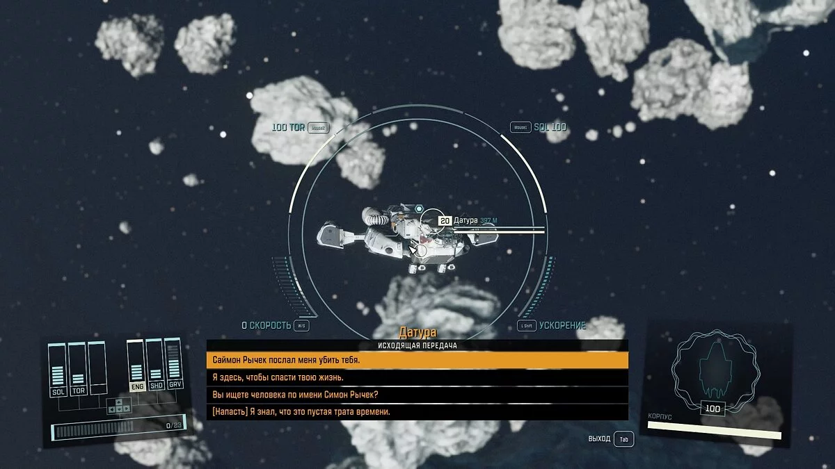 Если выберите последний вариант, то вам нужно вылететь на орбиту Сатурна и найти дрейфующее судно. Дальше всё зависит от вашей фантазии: уничтожьте корабль, возьмите его на абордаж и убейте капитана или попробуйте договориться. В последнем случае девушка должна отдать вам своё оружие в качестве доказательства для Саймона.