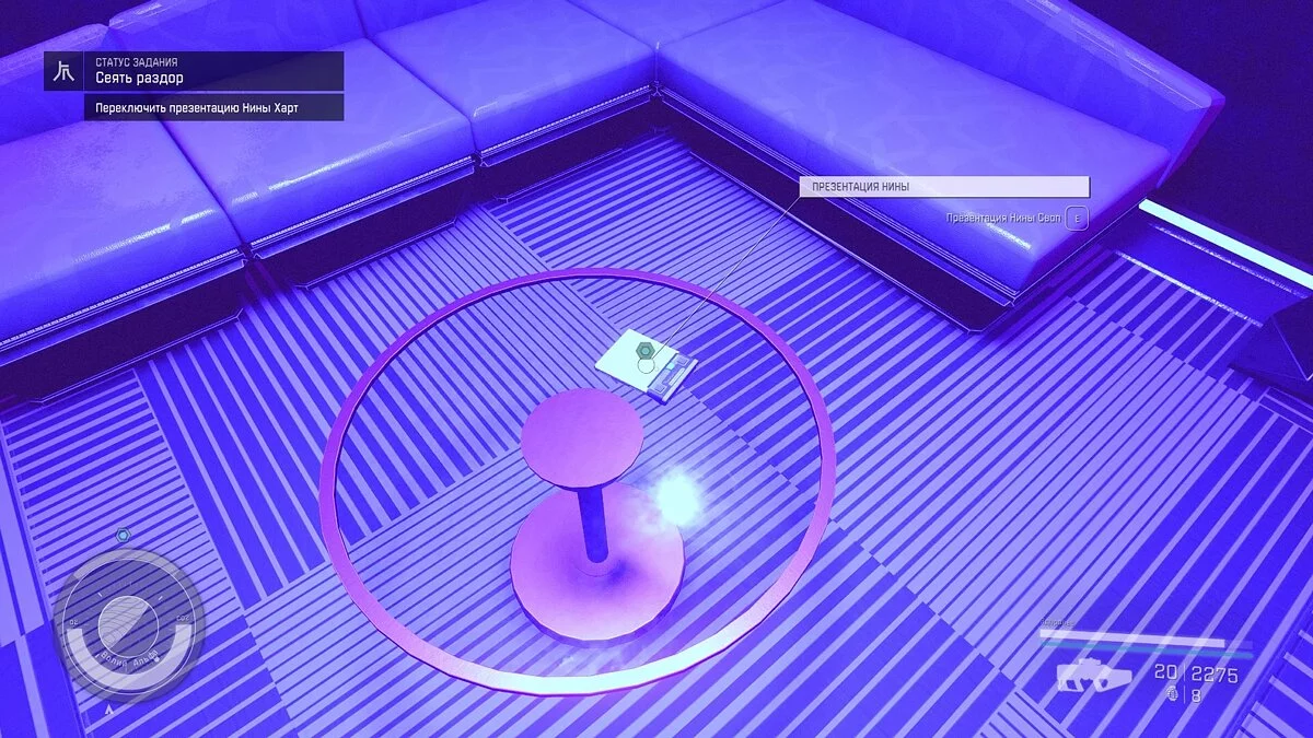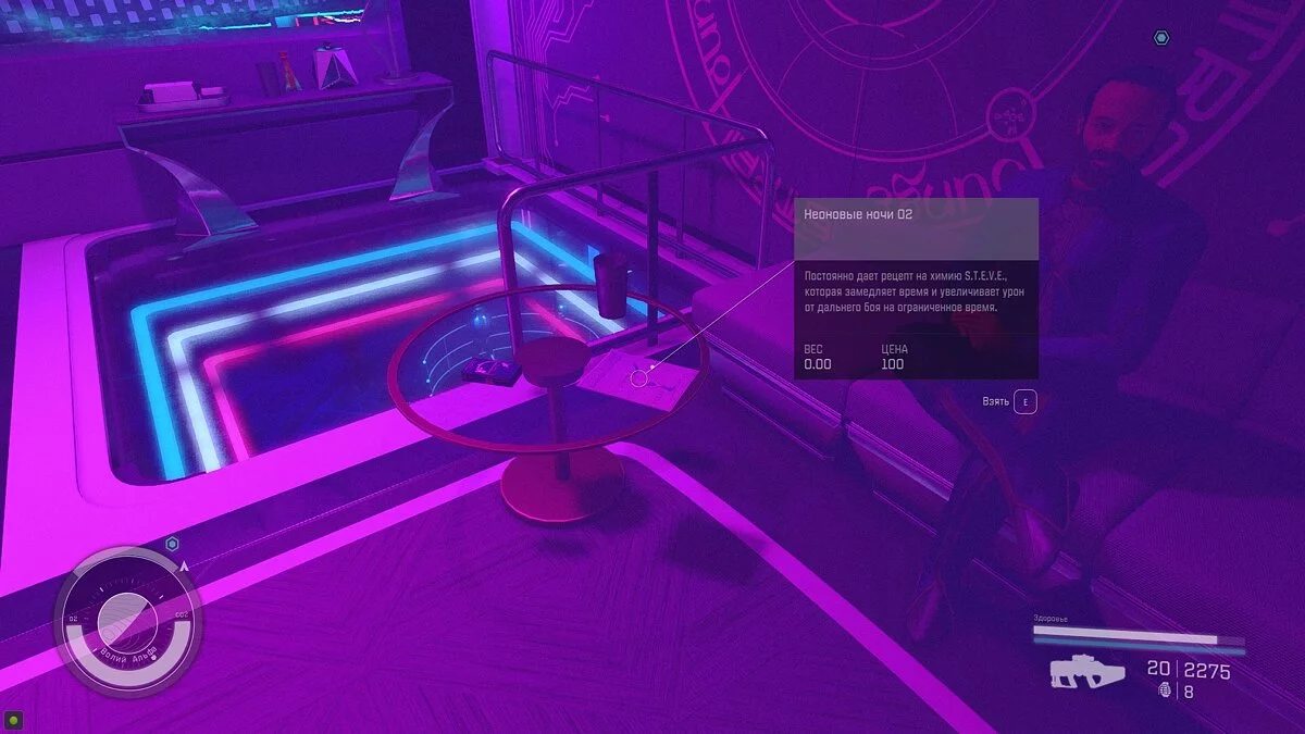 Поднимитесь на лифте на VIP-балкон и повторите действия с Артуром. Отметим, что на столике рядом с ним лежит журнал с постоянным бустом «Неоновые ночи 02».