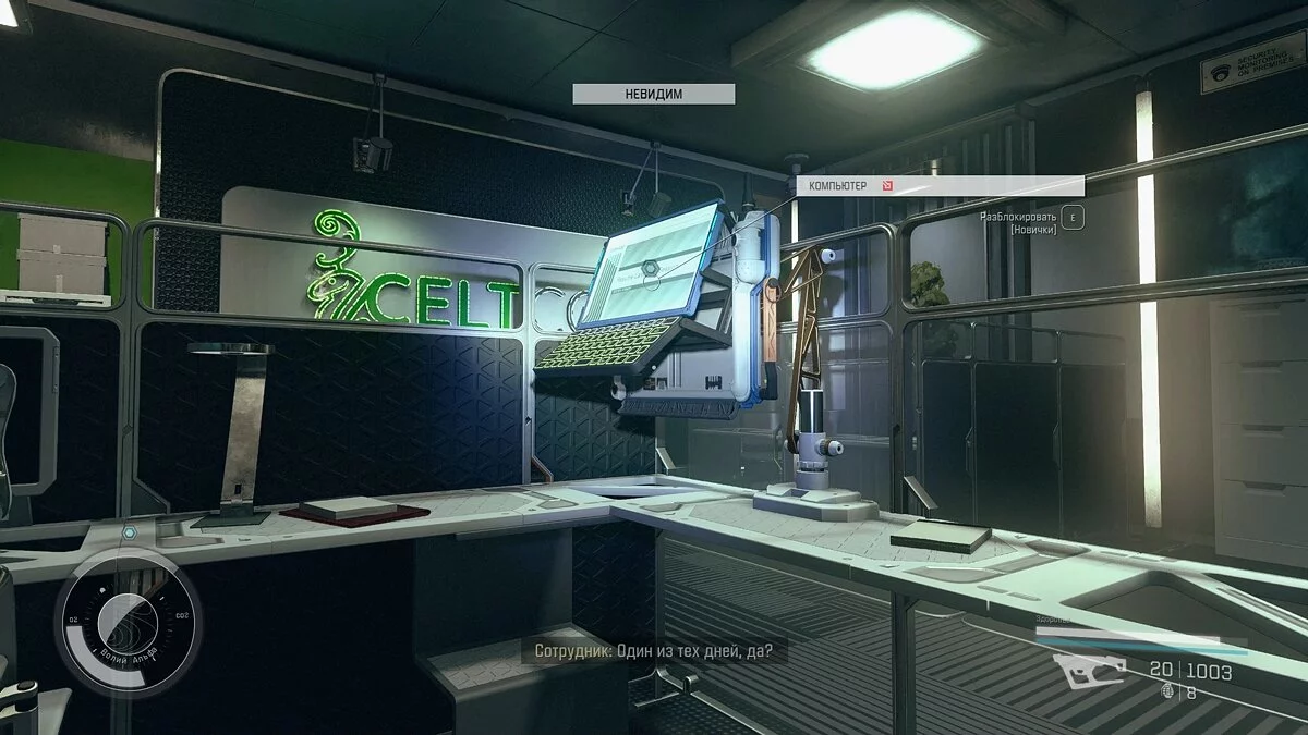 В офисном помещении находятся несколько человек. Подберитесь к терминалу и присядьте, чтобы вас не было видно. Взломайте компьютер (новичок), загрузите информацию и вернитесь к Имоджин.
