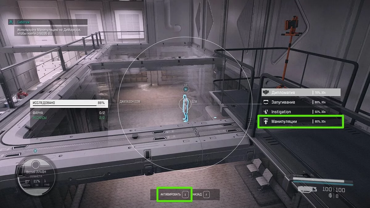 Для этого откройте сканер (кнопка «F») и направьте указатель на любого персонажа. Нажмите «E», чтобы открыть меню социальных навыков, затем прокрутите вниз и остановитесь на «Манипуляции».