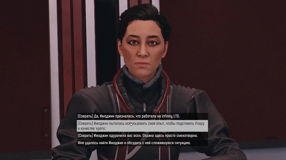 В любом случае вам предстоит беседа с женщиной, в которой Имоджин попытается оправдаться. Она отдаст вам планшет с доказательством вины Улару. Предлагаем не упускать возможность и заработать дополнительно 5000 кредитов.