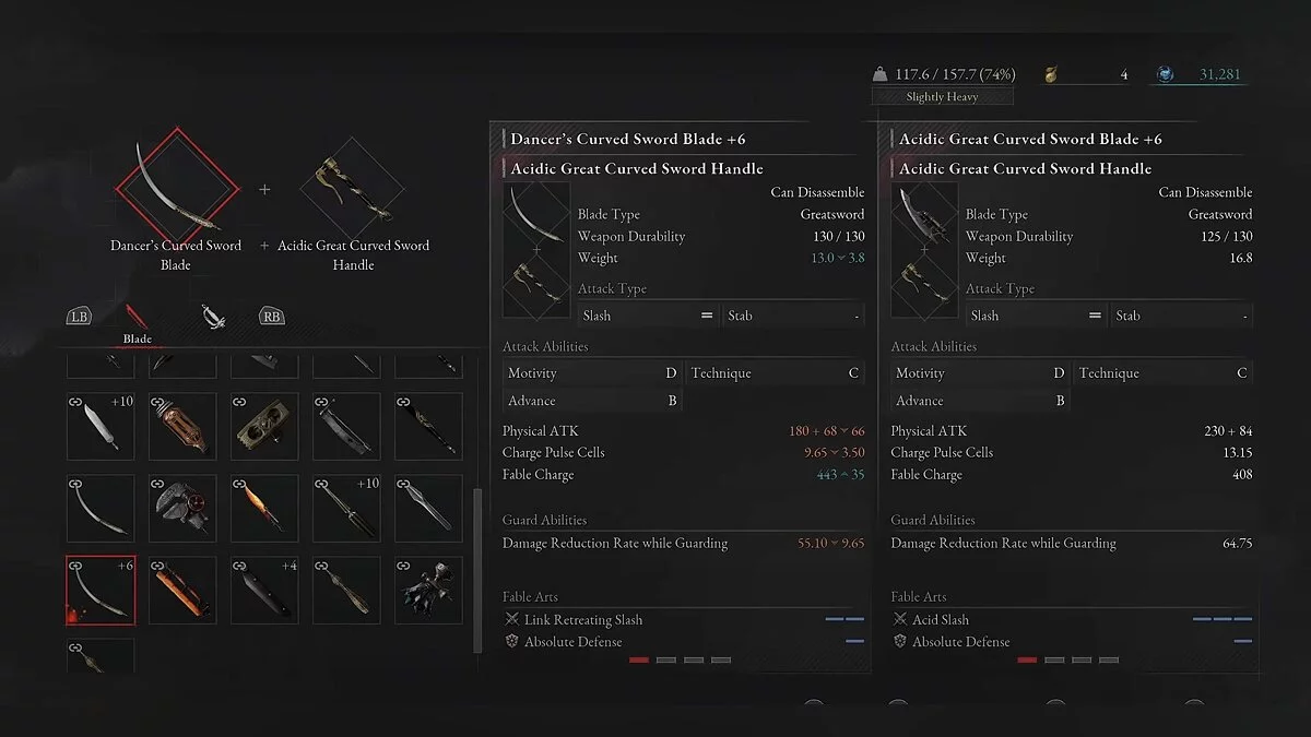 Здесь однозначного ответа нет, все зависит от вашей прокачки. Однако при комбинировании лезвий с рукоятями игра очень удобно показывает, какие именно параметры меняются. Старайтесь подобрать такое лезвие, которое будет устраивать вас не только способностью, но и количеством урона. Важны не столько общие повреждения, сколько специфические, например, урон от огня или кислоты. Если вы немного потеряете в физической силе, но получите значительный прирост от стихии, на такую заточку точно стоит обратить внимание.