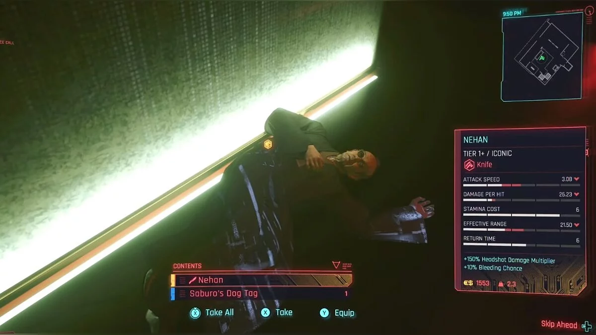 - Как получить: во время прохождения сюжетной миссии «Пропуск в высшую лигу» нужно обыскать труп Сабуро Арасака. Прохождению основных заданий Cyberpunk 2077 мы посвятили отдельное руководство.