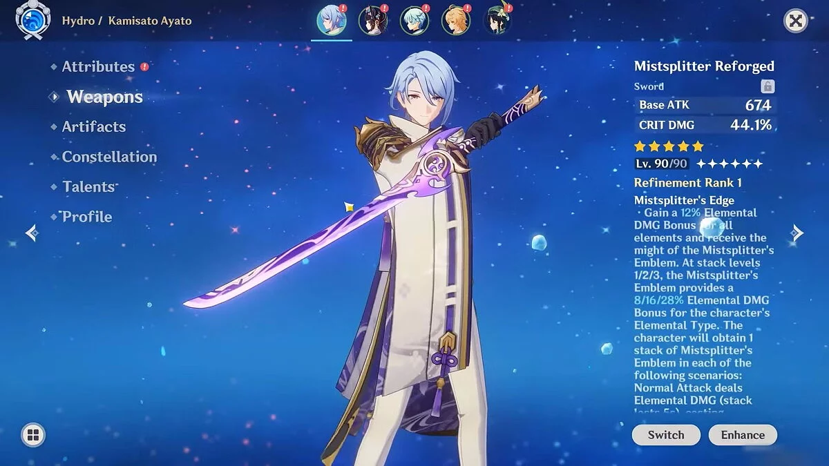 Отличный пятизвёздочный меч, которым можно вооружить Путешественника Гидро-стихии. Наносит урон в размере 48-674 единицы, а его критические удары увеличивают силу атаки на 9,6-44,1%. Однако гораздо важнее, что элементальный урон повышается на 12-24%. Если вы полоснёте врага мечом, применете взрыв стихий, раните противника элементельным навыком или просто потратите часть энергии, то получите 1 уровень Эмблемы рассекателя тумана. Бонус к элементальному урону вырастет ещё на 8-16%. На втором уровне эффективность атак увеличится 16-32%, а на 3-м — на 28-56%.