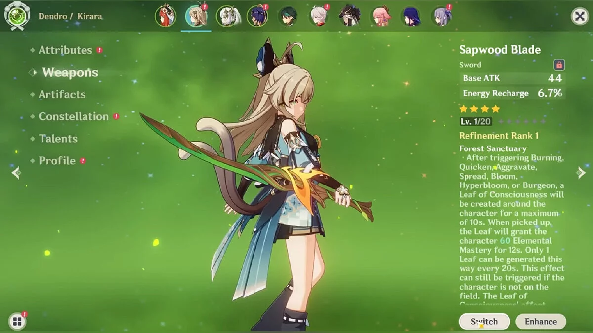 Четырёхзвёздочный меч с базовой атакой 44-565 единиц и дополнительным восполнением энергии 6,7-30,5%. Любая Дендро-реакция рядом с Путешественником будет создавать Семя сознания, которое увеличивает мастерство стихий на 60-120 единиц в течение 12 секунд. Эффект может проявиться 1 раз в 20 секунд. Для этого герою не обязательно находиться на поле боя.