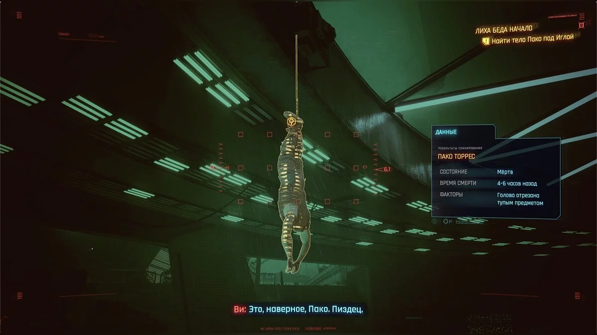 Ваша цель — выполнить обе просьбы. Выйдите из магазина и поговорите с Джонни. Он предложит позвонить знакомым риперам. Напишите Виктору и Джуди. Оба они дадут примерно одинаковые ответы. Нужно найти что-то, что будет очень важно для настоящей личности Тула. Возвращайтесь в подвал и осмотрите зону правее запертого Тула. На полу лежит письмо. Просканируйте его и прочитайте. Этого достаточно, теперь поезжайте к Лине.