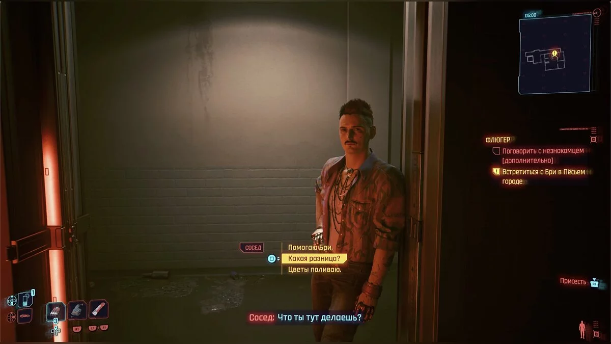 В квартире осмотрите бамбук в спальне. Ви сразу же обнаружит карту доступа. Теперь возвращайтесь в Пёсий город к месту встречи. Прежде чем выйти, вы встретите в дверях подозрительного соседа. Заболтайте его, после чего можно идти к лифту.