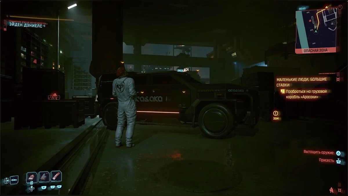 Продолжайте зачистку удаленно или вручную. Заберитесь по ящикам справа, если стоять спиной к носу корабля, и двигайтесь вперед. Далее точно так же аккуратно пробирайтесь по контейнерам, чтобы в итоге оказаться рядом с грузовиком. Как только вы сядете за руль, поднимется тревога.