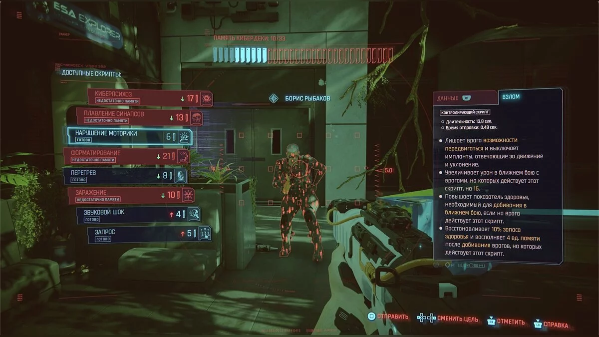 Как только вы доберетесь до нужной двери, появится киллер Борис. Бой с ним может вызвать проблемы. Во-первых, он очень быстро перемещается и регулярно применяет маскировку, благодаря которой его сложно заметить на местности. Во-вторых, босс постоянно вызывает дронов и проекции. Победная тактика проста — накидывать на Борю как можно больше скриптов за раз, желательно с «Нарушением моторики», так как это его замедляет. После успеха заходите в нужное помещение.