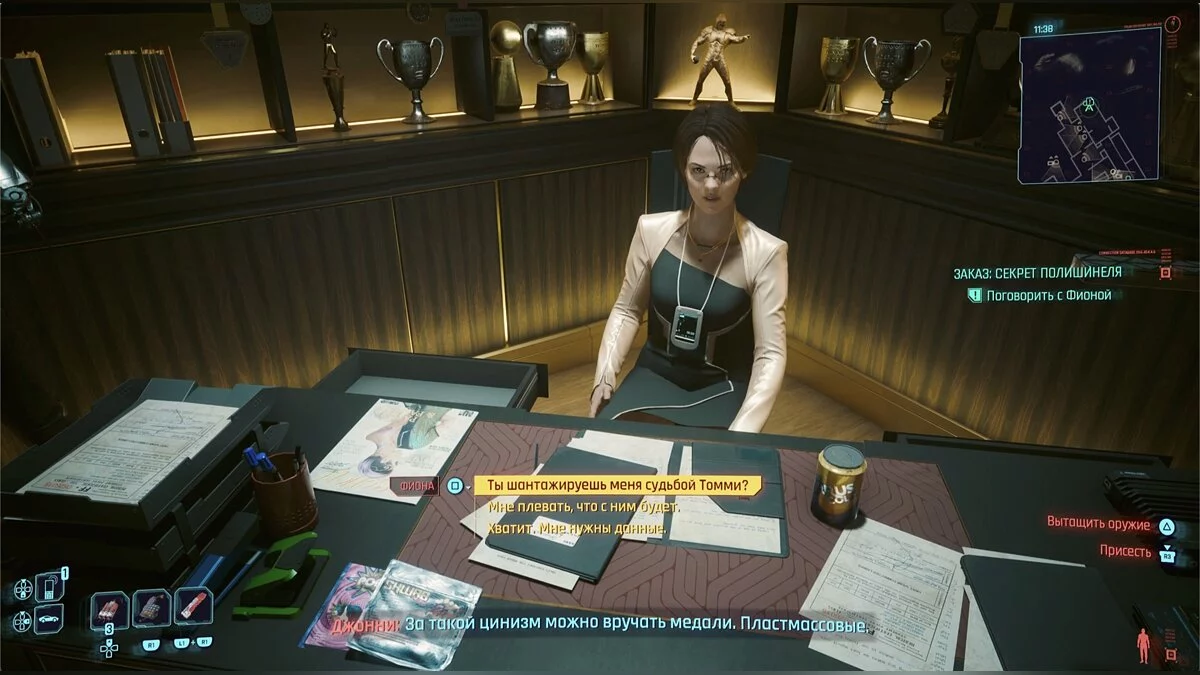 Добравшись, вы услышите диалог за дверью, дослушайте его до конца и заходите. Поговорите с прокуроршей. Она покажет видео, из которого станет понятно, что отец сам сдал сына за деньги. Ви предложат выбор — либо забрать сведения, которые просил заказчик, либо оставить сведения и просто удалить имя отца из показаний.