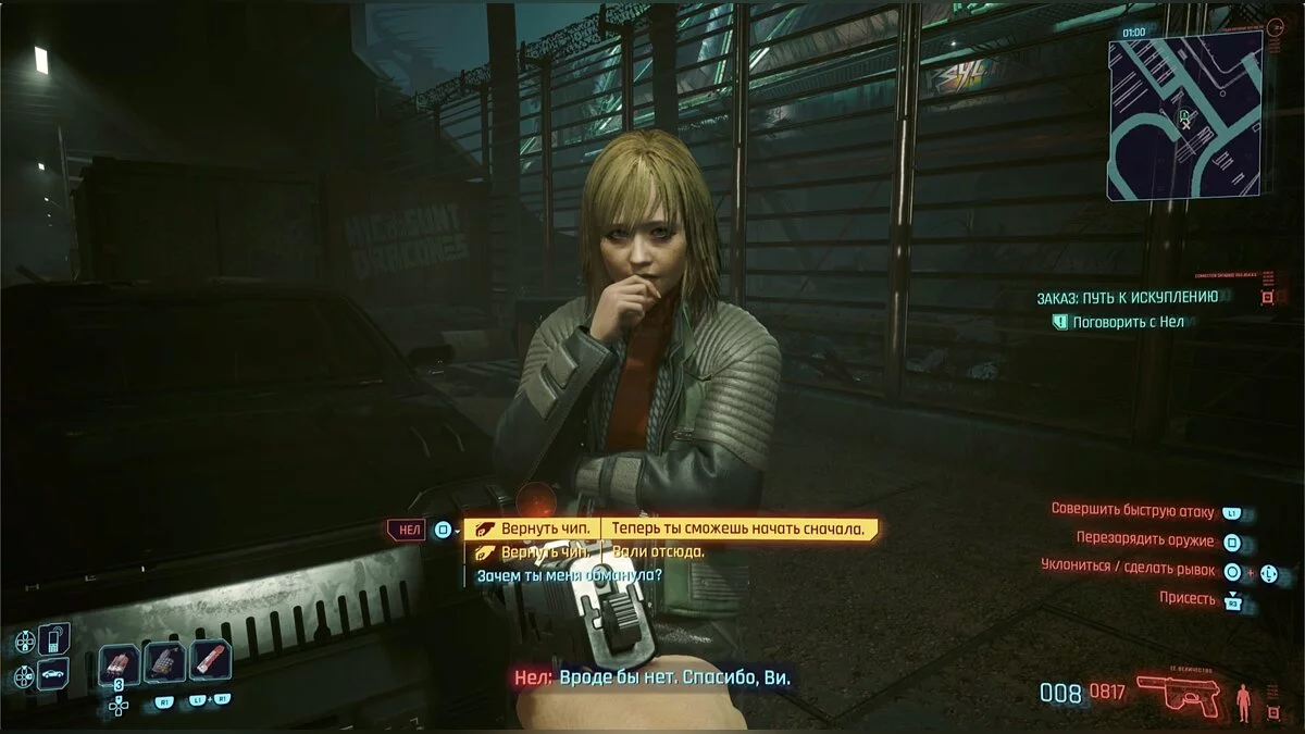 Впрочем, если вы достаточно хитрый, можно пойти и третьим путем. Согласитесь на вариант пощадить, чтобы сразу же получить координаты тайника, после чего пристрелите Катю.