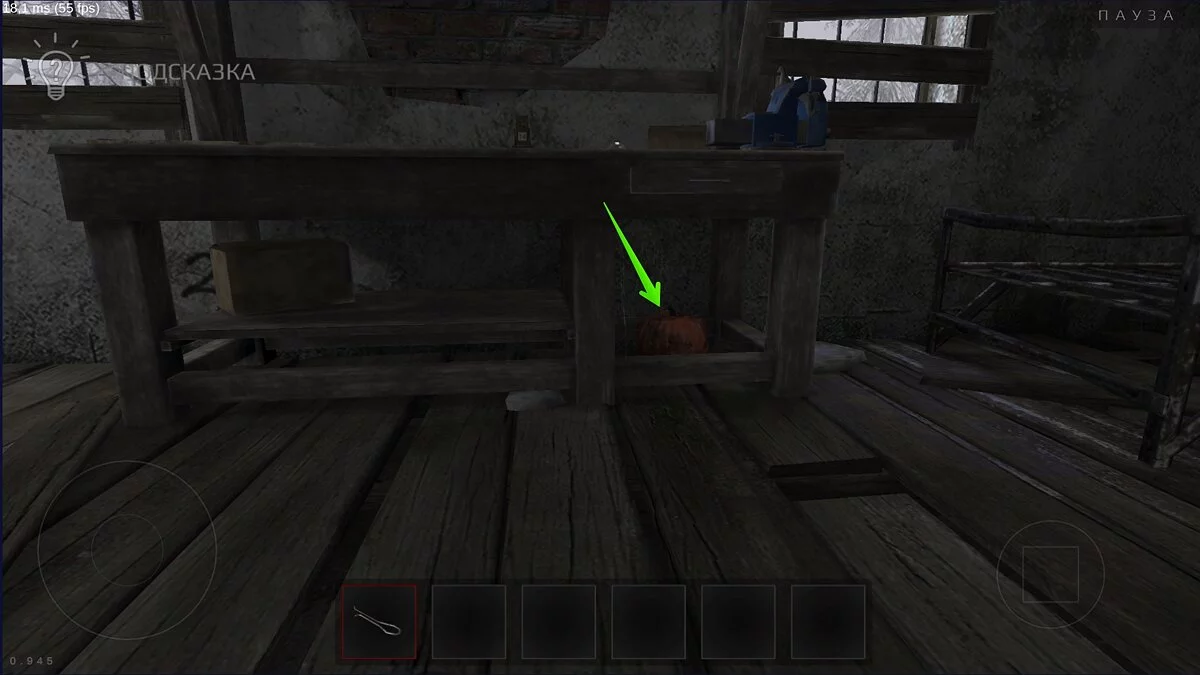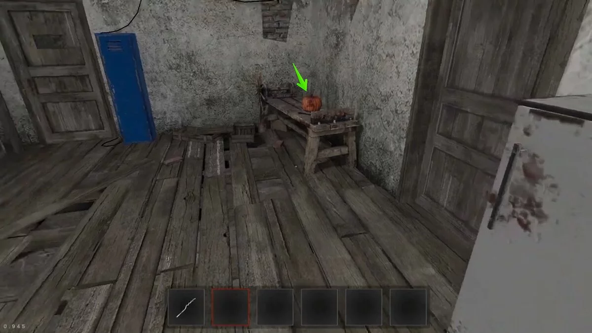 Продолжайте проходить уровень, пока не откроете промежуточную комнату. Тыква лежит на импровизированном верстаке.