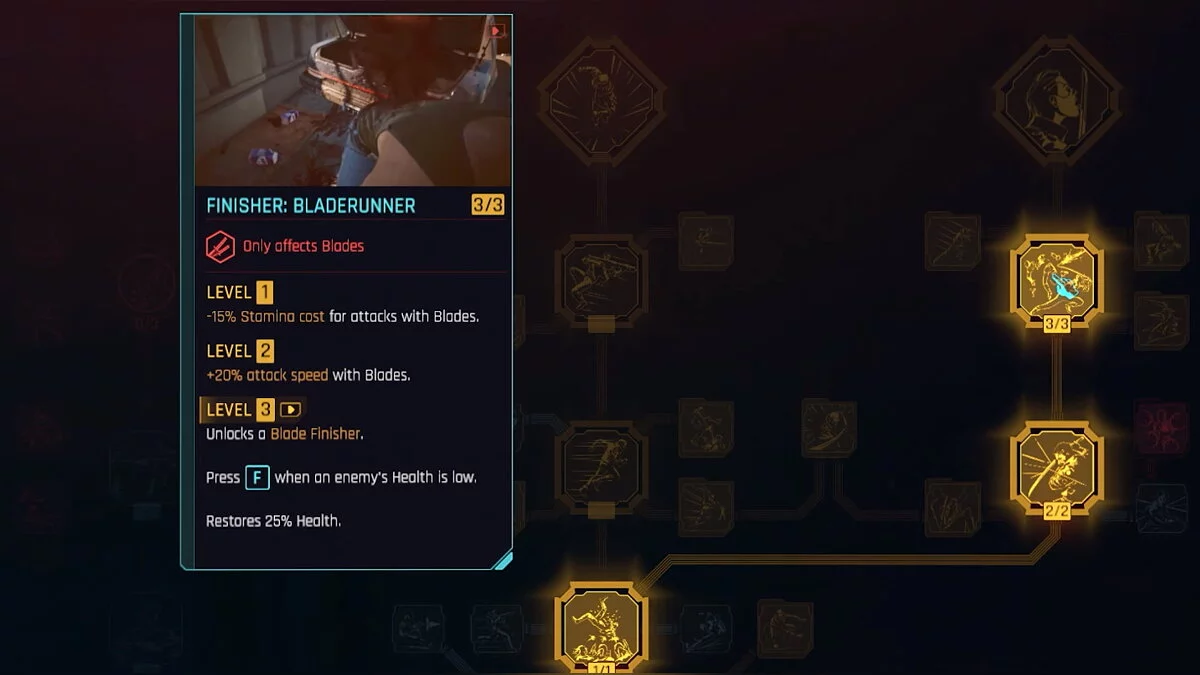 - Бегущий по лезвию. Снижает расход выносливости от ударов клинками на 15%, увеличивает скорость нанесения ударов ими на 30%, позволяет добивать противников, у которых меньше 25% здоровья.