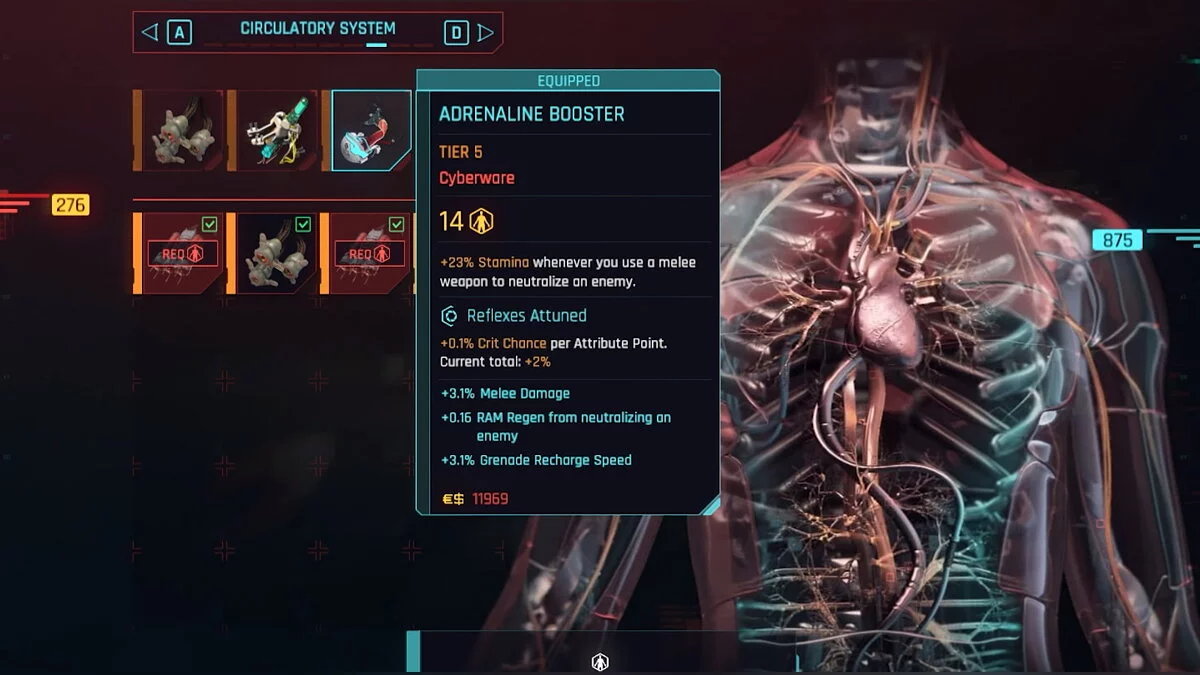 - Кибернетическое телосложение. Если все ячейки для аугментаций заняты, входящий урон снижается на 5%.