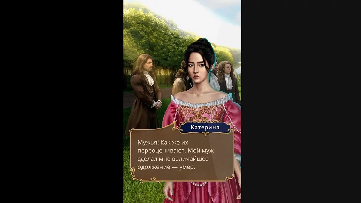 Девушка оказывается в окружении придворных дам, они все вместе обсуждают мужей и просто сплетничают.