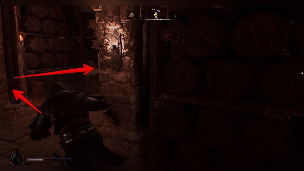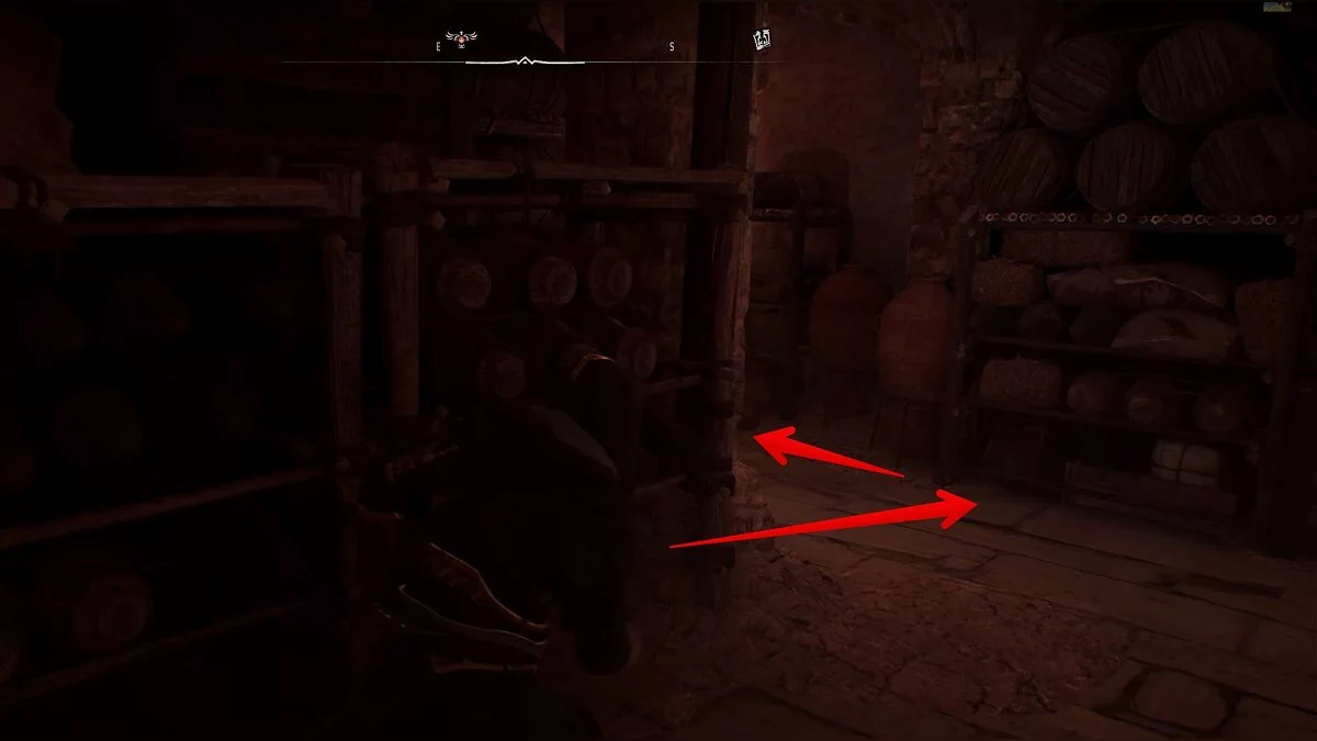 Спускайтесь вниз, поворачивайте налево, бегите вперёд, а затем — направо. Там вы увидите стеллаж, который нужно потянуть на себя. Вернитесь назад, пройдите в открывшийся проход. Слева будет ещё один шкаф, который нужно отодвинуть.
