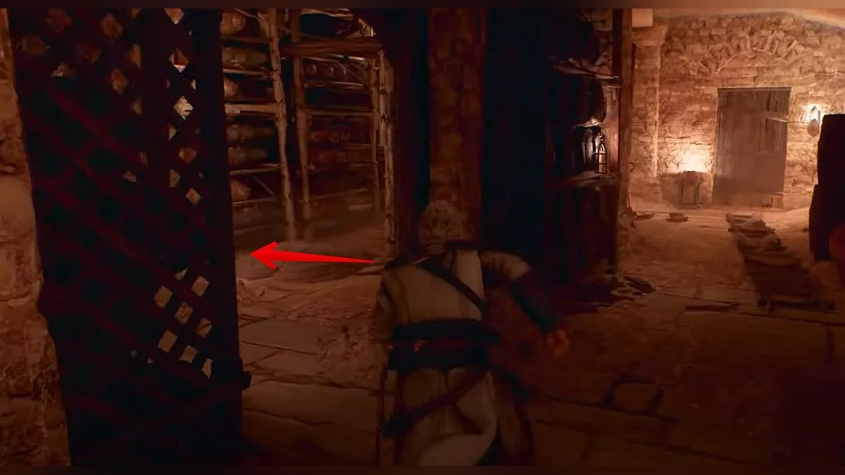 По лестнице спуститесь вниз. Справа вы увидите решётку. Прицельтесь в кувшин с горючим и метните в него метательный нож.