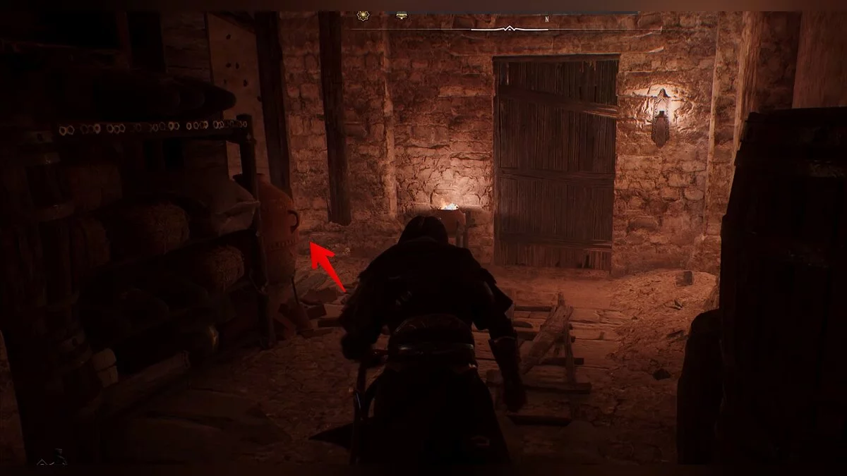 Необходимо подняться наверх, взять кувшин и с его помощью взорвать хрупкий пол, который находится позади вас.