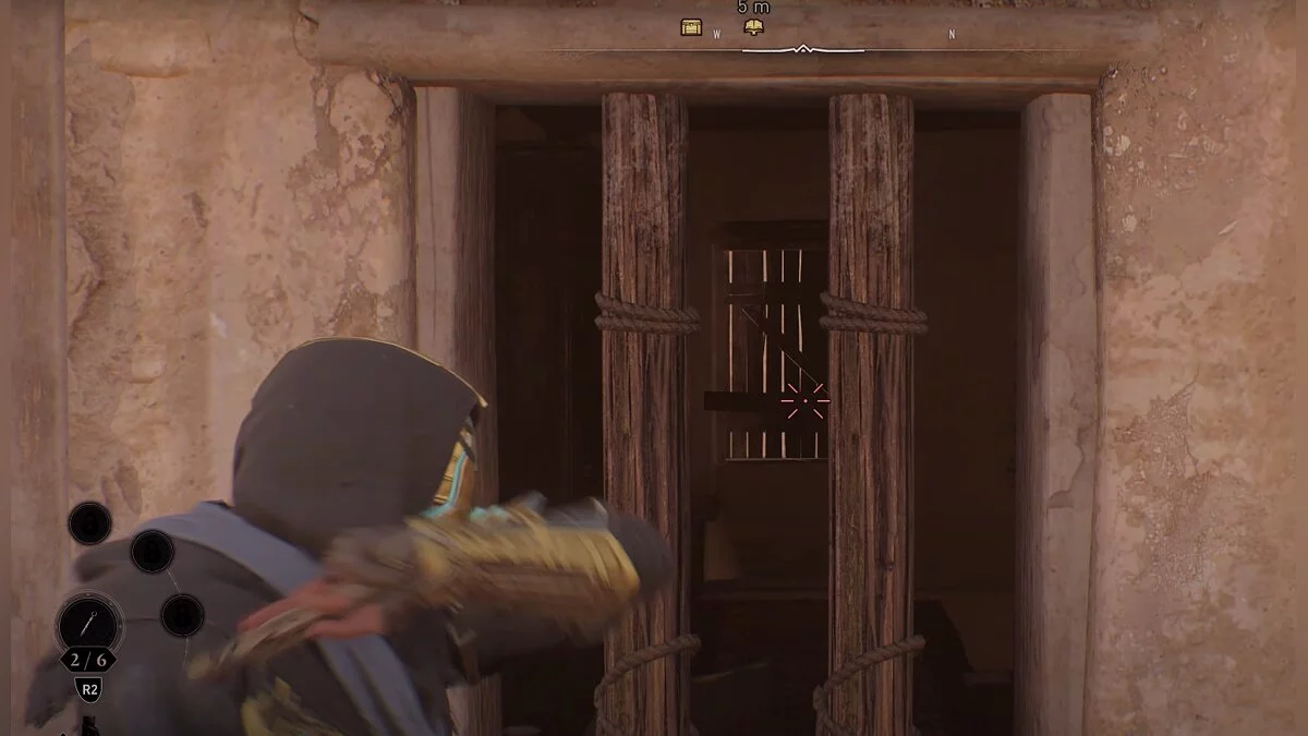 Забирайтесь на крыльцо дома. Через окно с решёткой вы сможете увидеть замок. Сломайте его броском метательного ножа.