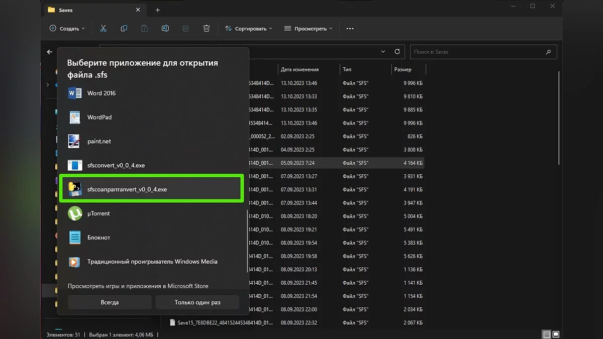 - Перейдите в каталог с файлами сохранений и попытайтесь открыть любой файл с расширением .SFS.